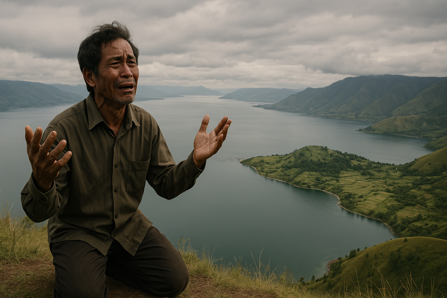 Toba yang sangat merasa kehilangan, lalu pergi mencari istrinya ke tempat yang tidak diketahui. Dalam pencariannya yang penuh kesedihan, Toba naik ke sebuah bukit yang tinggi dan menatap ke arah sungai tempat ia pertama kali bertemu dengan Boru Samosir. Di sana, ia berdoa dengan penuh harapan agar bisa menemukan kembali istrinya. Saat Toba berdoa, tiba-tiba tanah di bawah kakinya bergoyang dan air mulai meluap. Tanah pun mulai terbelah, dan air menggenangi wilayah sekitar. Dalam sekejap, seluruh daerah itu menjadi danau yang sangat luas. Danau ini kemudian dikenal dengan nama Danau Toba, dan pulau kecil di tengahnya dikenal sebagai Pulau Samosir, yang merupakan tempat di mana Toba dan Boru Samosir pernah tinggal.