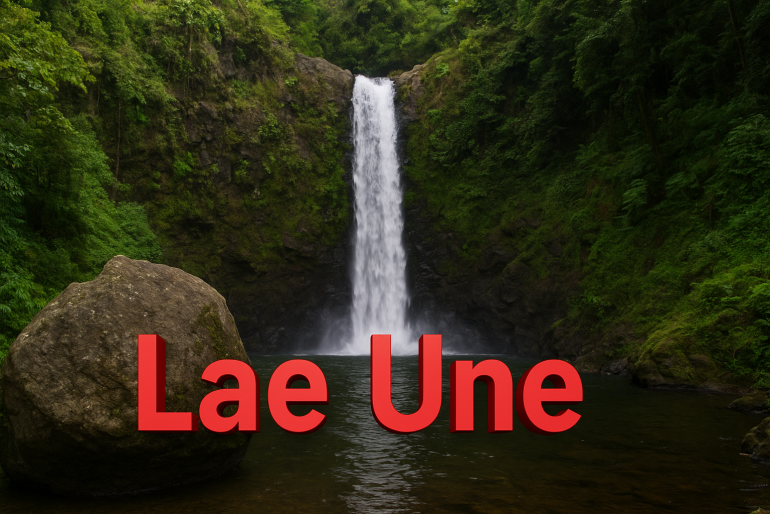 Putri Nan Tampuk Emas memperoleh tenaga gaib dengan tiba-tiba. Tubuhnya yang sudah lemah terkulai memperoleh energi untuk bangkit dan seakan berlari diatas cadas yang penuh dengan lumut. Tiba di air yang semakin dalam dia berenang dengan ringan seperti seperti tak memerlukan tenaga untuk mengayunkan kaki dan tangan. Air yang berputar berbalik arah mengalir kearah air terjun sehingga menyebabkan dia seperti terhanyut bukan berenang. Nan Tampuk Emas mendekati pusaran air yang semakin kuat, pada saat itulah umang melemparkan bayi ( Undung Une ) pusat pusaran air. Nan Tampuk Emas berusaha mengejar dan meraih anaknya tetapi tangannya tak sampai menggapai. Putri Nan Tampuk Emas dan putranya Undung Une lenyap ditelan pusaran air. Seluruh penduduk mencari mayat sang putri dan bayinya namun tidak pernah ditemukan. Setiap pagi orang selalu pergi ketempat itu dengan harapan dapat menemukan bagian tubuh putrid Nan Tampuk Emas dan bayinya. Mike ko we.. ??? (Mau kemana kamu) ” jika ada orang bertanya kepada orang yang mencari bagian tubuh putrid Nan Tampuk Emas dan Undung Une, mereka menjawab “Mi Lae Une “jawaban singkat bahwa dia menuju sungai untuk mencari Undung Une. Demikianlah sampai sekarang air terjun tersebut dinamakan LAE UNE. (Diceritakan Ulang Oleh W. Banurea)